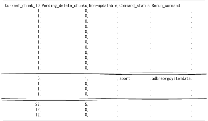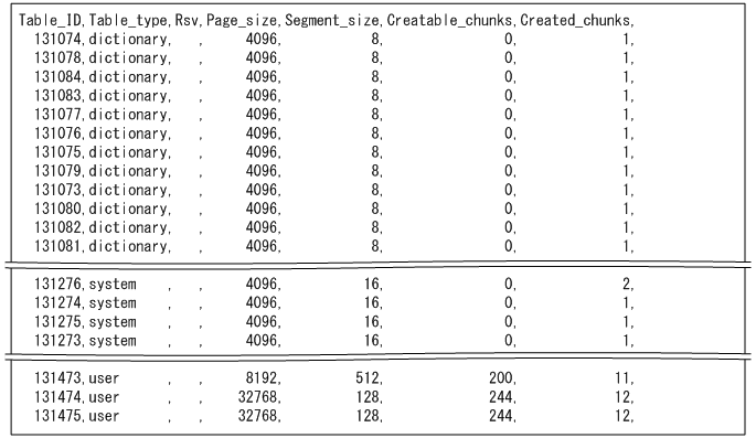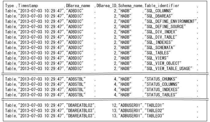 表のサマリ情報の出力例を次に示します。なお,実際の出力結果は横に長いため,ここでは分割して記載しています。