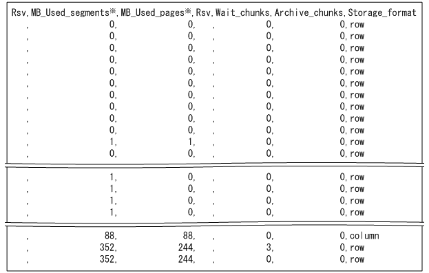-Sオプションの指定によって,使用量に関する出力項目の表示単位,および列のタイトルが変更されます。-Sオプションの詳細については,「13.2.1 指定形式およびオプションの説明【サマリ情報・使用量情報を出力する場合】」の「(3) オプションの説明」を参照してください。