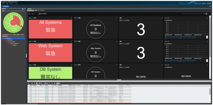 統合オペレーション・ビューアーにログインすると,右上にシステム全体のダッシュボードが表示され,システム全体の重要イベントの状態,アラート情報,未対処イベント数,イベントの対処状況を確認できます。