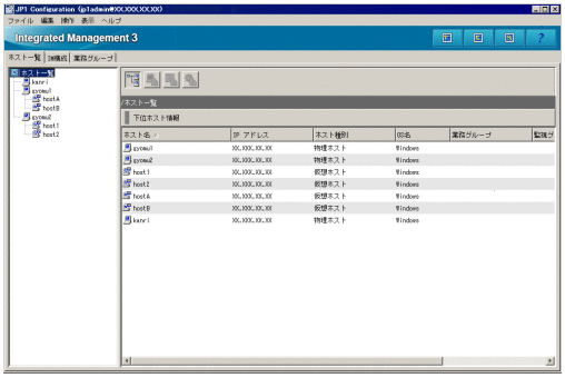 画面の詳細については,マニュアル「JP1/Integrated Management 3 - Manager 画面リファレンス」の「5.1.1 [ホスト一覧]ページ」および「5.1.2 [IM構成]ページ」を参照してください。