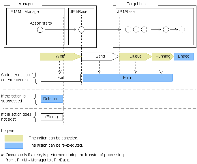 The flow of processing is always from JP1/IM - Manager to JP1/Base on the manager, and then from JP1/Base on the manager to JP1/Base on the target host. When the processing is successful, the status transition is Send, Queue, Running, and Ended, in that order. When the send buffer to JP1/Base is full, the status transition is Wait, Send, Queue, Running, and Ended, in that order. If an error occurs, the action status is set to Fail or Error, and processing terminates.