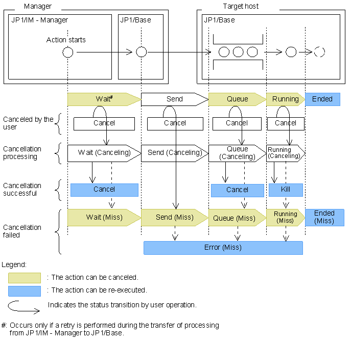 When a cancellation request is issued for an action in Send status, the deletion processing is not performed until the action execution request is queued in JP1/Base on the target host. Depending on the action status when the cancellation request reaches JP1/Base, the cancellation processing might fail. If the action has reached Ended or Error status, cancellation fails.