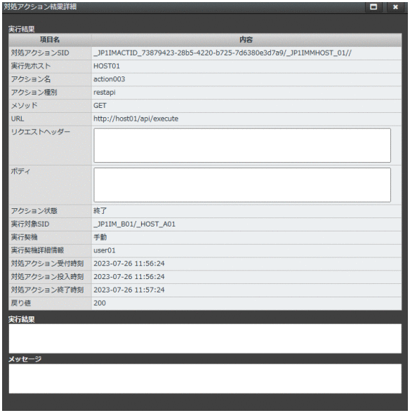 [対処アクション結果詳細]画面は,対処アクションの実行結果の詳細を確認する画面です。[対処アクション結果一覧]画面の[詳細]ボタンをクリックすると,表示されます。