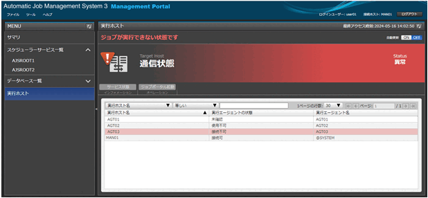 [実行ホスト名]で実行ホストを選択し,[ジョブポータル起動]ボタンをクリックすると,ジョブポータルの[実行エージェント]画面に遷移して実行エージェントを操作できます。