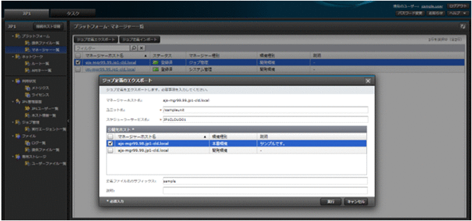 サービスで提供されるマネージャーホストについて,情報表示,ジョブ定義のエクスポート,ジョブ定義のインポートができます。例えば,開発環境のJP1/AJS3(ジョブ管理,V01-12以前はジョブスケジューラー)のマネージャーから開発したジョブ定義をエクスポートし,本番環境のJP1/AJS3(ジョブ管理,V01-12以前はジョブスケジューラー)のマネージャーにジョブ定義をインポートすることで,マネージャー間でジョブ定義を移行・配布することができます。