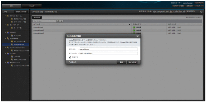 サービスで提供されるホストについて,エージェントとして使用するためにマネージャーに登録されているサーバーのhosts情報の表示,新規登録ができます。hosts情報は,マネージャーとエージェント間で通信する際の名前解決のために登録が必要になります。