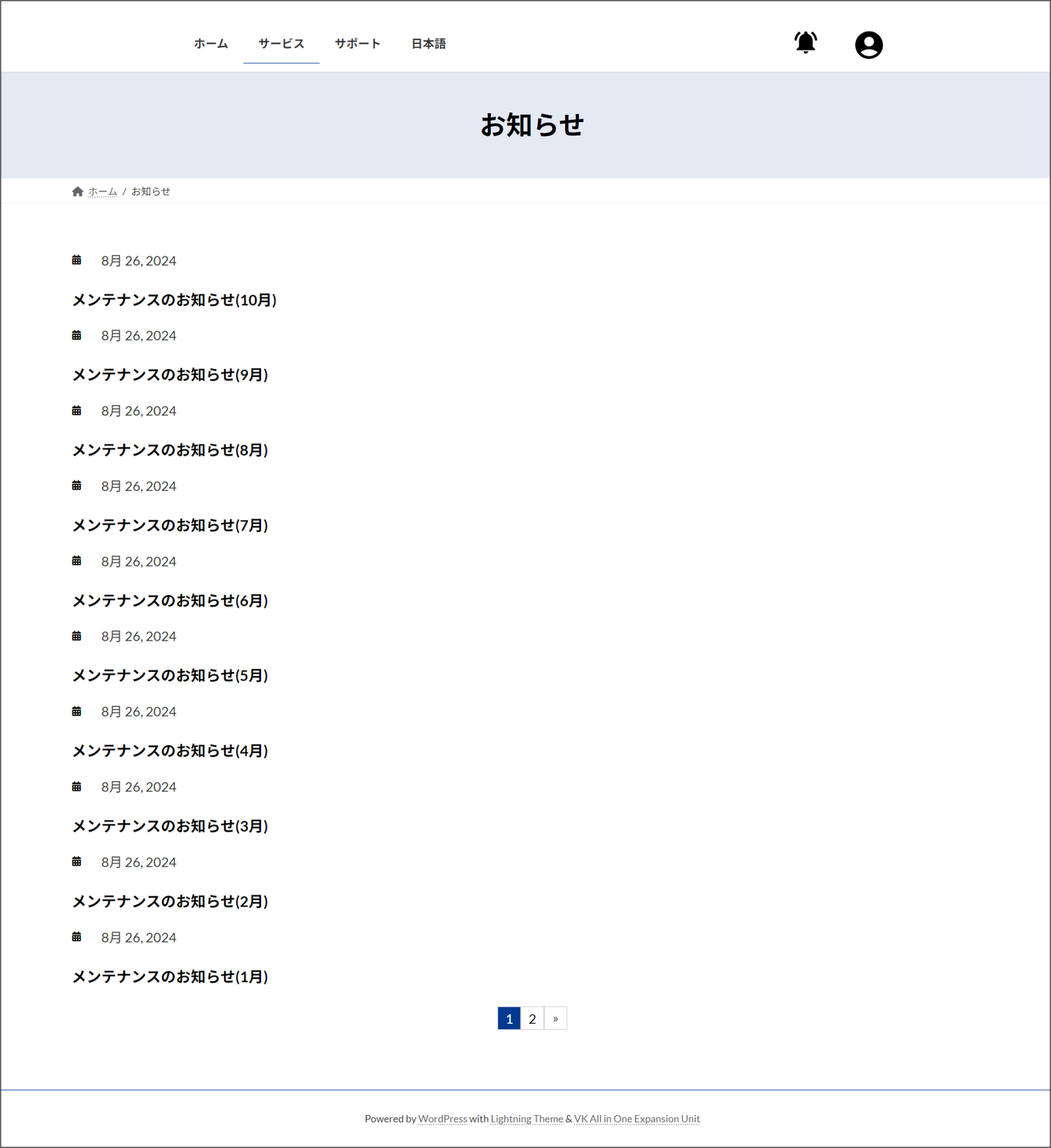 カスタム投稿タイプ「News」が一覧表示されます。一覧は投稿の"Date"の降順にソートされます。1ページに10件としてページネーション可能です。
