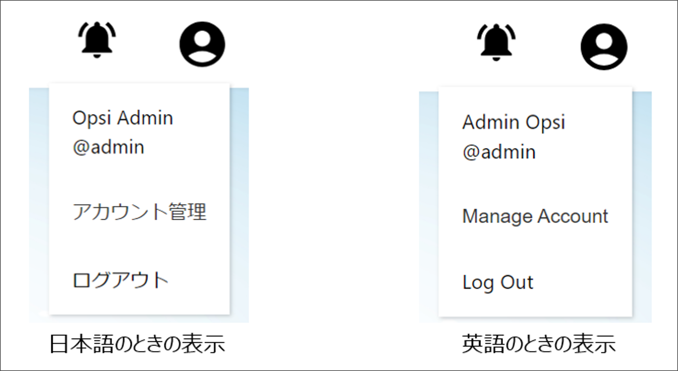 The [Ops I Menu] of pages and posts set to a language other than Japanese will be displayed in English. When you mouse over the [Ops I Menu] avatar in English, the [username], [Manage Account] and [Log Out] menus will be displayed. [username] is displayed in the format “first name (firstName) last name (lastName)@username”.