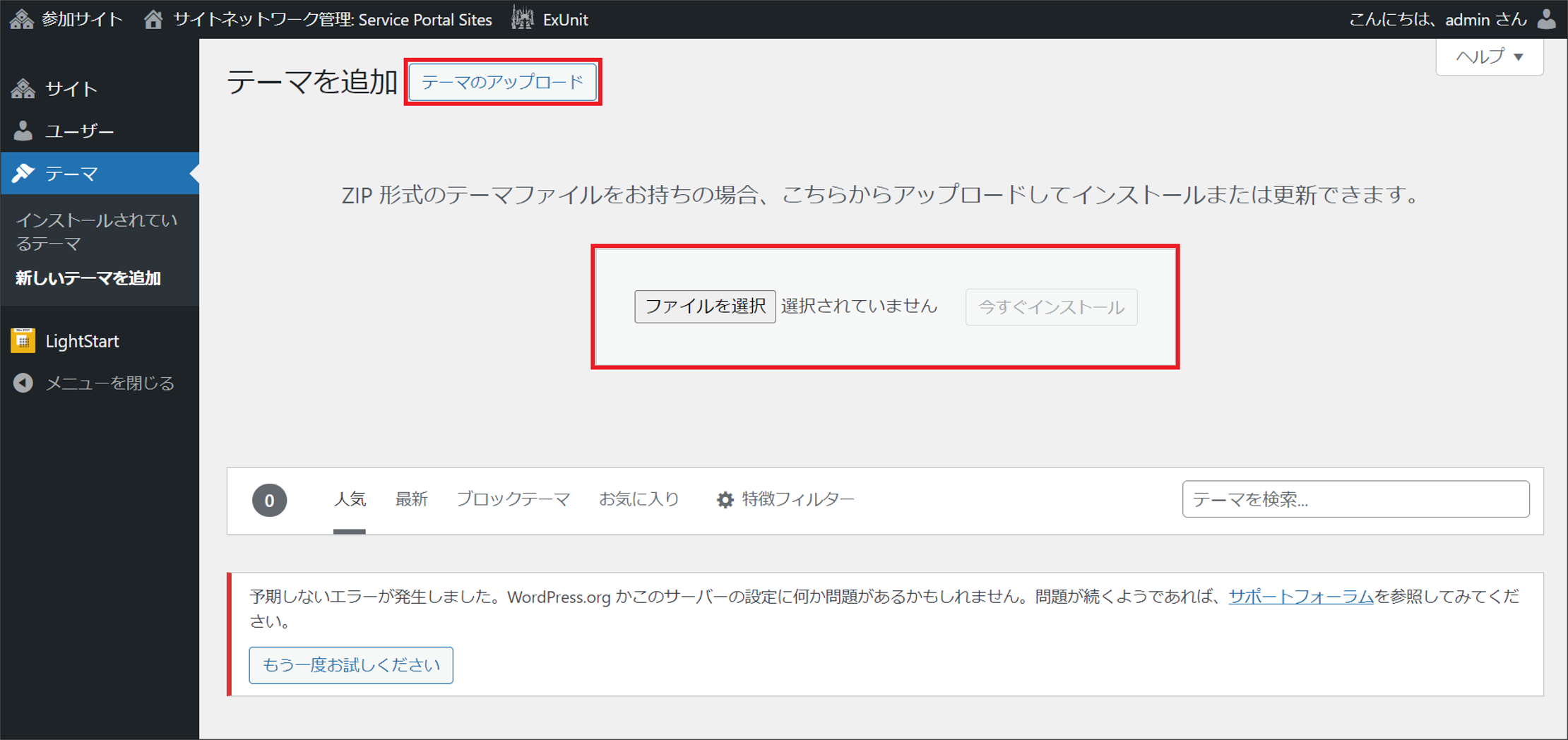 - On the [Themes]-[Add New Theme] window on the [Network Admin] window the message "An unexpected error has occurred" is displayed, but this does not affect theme installation.