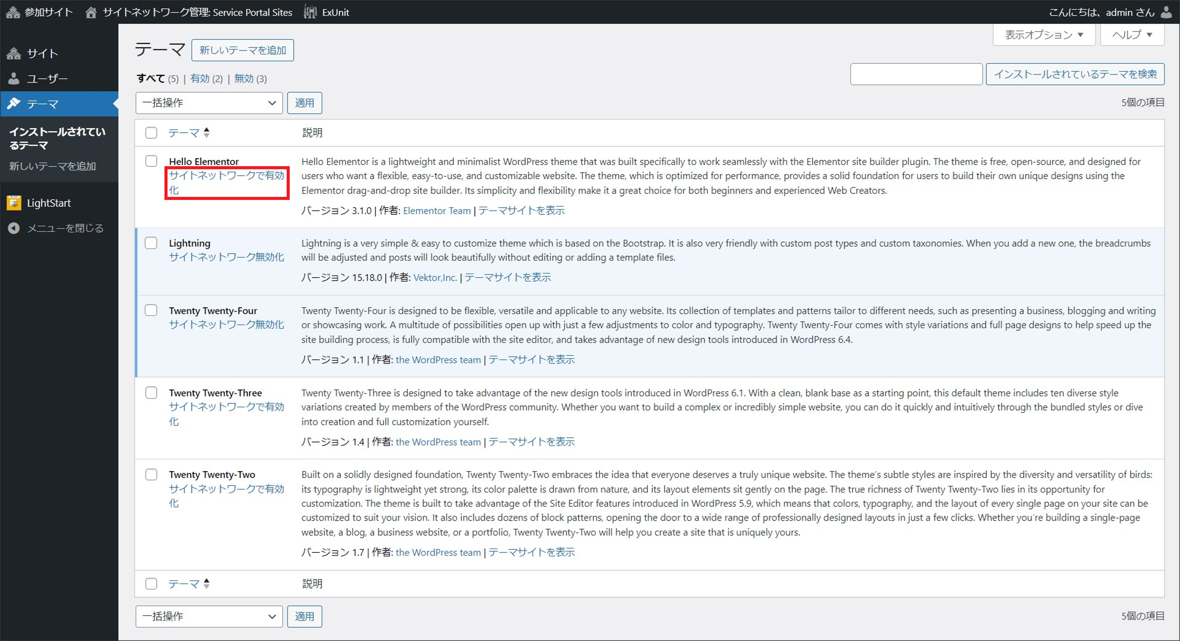 ② The site network administrator can enable a theme by clicking [Network Enable] for the installed theme from [Themes] on the [Network Admin] window.